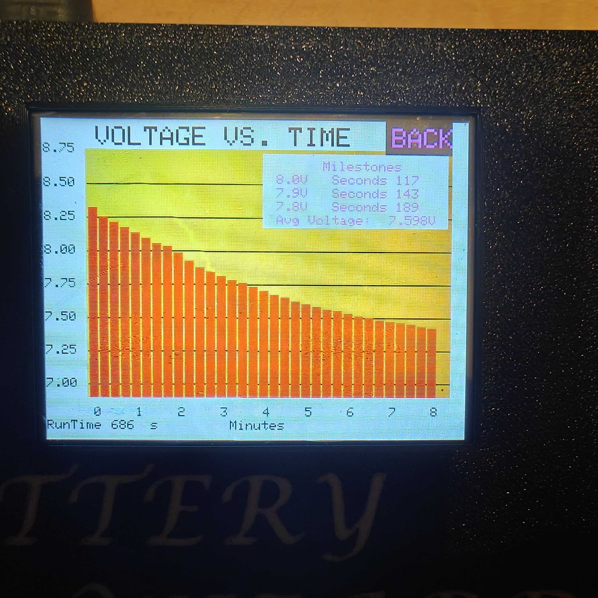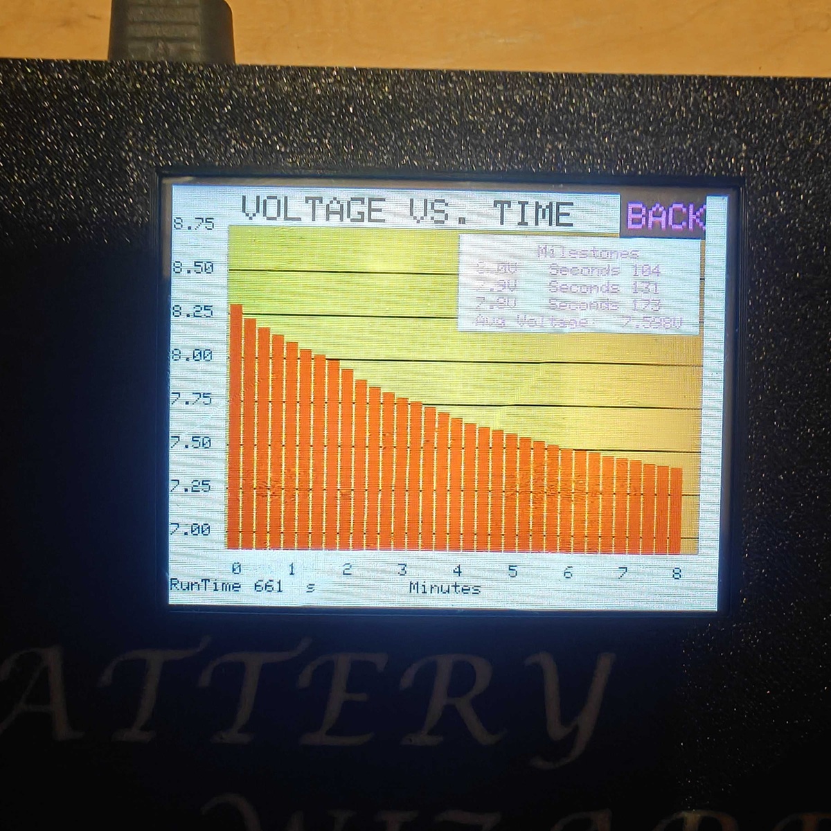 Using the WMH Racing Battery Wizard below is the IR and voltage drop test at 200A simulation load. You can see voltage drop of the V2 Mudboss pack versus our new RS-V3 Mudboss pack. Please note there is no heating of the pack. Pack is charged at 12A from storage voltage and tested at 22C/72F. Second set of pictures is the voltage curve with the seconds it takes to get to 8v , 7.90V and 7.80V.